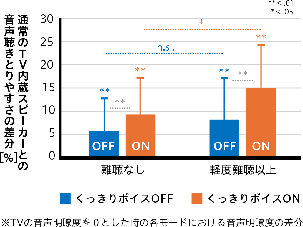 さらに、軽度難聴以上の方では、難聴のない方と比べ、くっきりボイスONによる音声の聴きとりやすさがより大きく向上し、くっきりボイスモードの効果をより強く受けられることも確認できました。